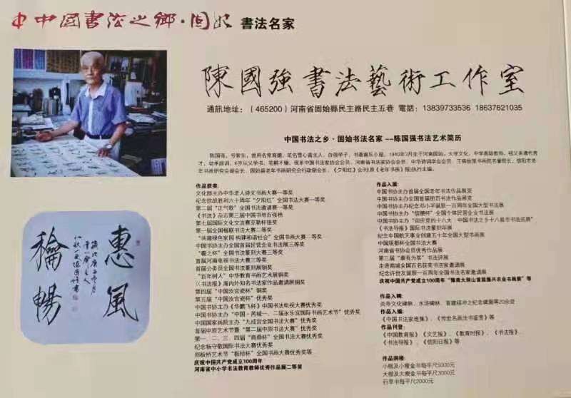 著名书法家陈国强部分代表作品及其简介:陈国强,号紫东,笔名雪心斋主人,自强学子,曾用名常育德。1940年生于河南固始,大学文化,中学高级教师。祖父系清代秀才,幼承家教,六岁从父学书,笔耕不辍......