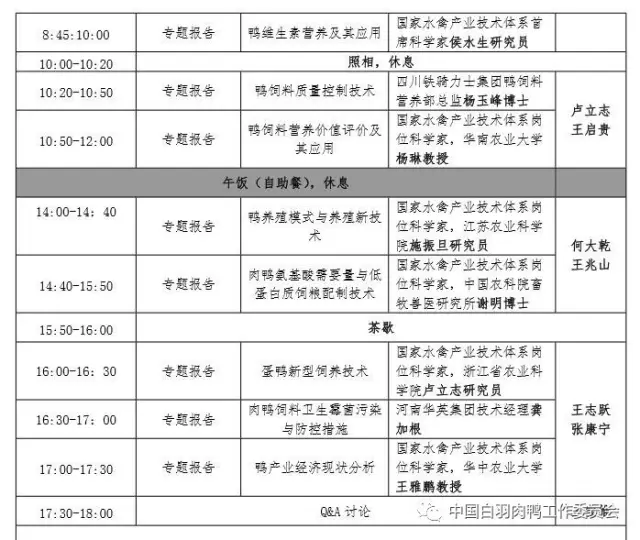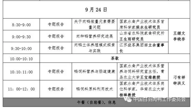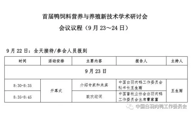 关于举办首届鸭饲料营养与养殖新技术 学术研讨会的通知(中原大众经济网讯:王耀) 各有关省(区)行业协会、学会,各会员、有关企事业单位: 我国未来的肉鸭、蛋鸭产业面临着供给侧改革、调结构、转方式、减排、排泄物资源化利用等技术问题。饲料资源匮乏,导致鸭饲养成本提升、鸭肉品质亟待改善等,是我们面临的重大产业技术问题。自国家水禽产业技术体系组建以来,我国在鸭营养与饲料研究方面取得了巨大进步,积累了大量有应用价值的数据资料,对提高我国鸭饲料的技术含量、竞争力将发挥重要作用。 中国畜牧业协会白羽肉鸭工作委员会、国家水禽产业技术体系联合主办本次鸭养殖技术与饲料营养学术研讨会,目的是将近 5 年来我国在鸭养殖技术、饲养方式、饲料营养与饲料配制技术、鸭饲料原料营养评价技术等方面取得的最新研究成果,特别是“国家水禽产业技术体系”取得的研究成果展示给水禽生产企业、大学及研究单位的科技工作者,希望通过交流、培训提高我国肉鸭、蛋鸭企业的养殖技术水平,提高鸭的健康水平、饲料利用率、排泄物资源化利用效率等,促进鸭产业转型升级,实现合作共赢。 首届“鸭营养与饲料配制技术及养殖新技术学术研讨会”将在国家水禽产业技术体系的岗位专家、综合试验站的共同努力下,在国内外企事业单位的共同参与下,构建内容丰富的蛋鸭、肉鸭产业技术交流平台,共同探讨、分享水禽产业科技进步的成果。这是我国肉鸭、蛋鸭养殖行业共谋发展的一次盛会! 本次鸭学术交流会由中国畜牧业协会白羽肉鸭工作委员会、国家水禽产业技术体系主办,由蓝城农业研究院有限公司、河南华英农业发展股份有限公司承办,定于 2017 年 9 月22~24 日在河南信阳举办。 为方便各界领导、新老朋友广泛参与本次学术研讨会,现将大会举办的有关事宜通知如下: 一、研讨会主题 鸭饲料高效利用与养殖新技术 二、主办与承办单位 1、主办单位 中国畜牧业协会白羽肉鸭工作委员会 国家水禽产业技术体系 2、支持单位 待定 3、承办单位 蓝城农业研究院有限公司 河南华英农业发展股份有限公司 三、参会对象 1、鸭饲料企业管理和技术人员 2、鸭养殖企业、合作社管理的技术人员 3、各省相关协会、学会会员 4、国家水禽产业技术体系的相关岗位专家、综合试验站站长及其团队人员5、院校、科研院所专家和研究人员、研究生 6、水禽产业设备设施生产企业管理和技术人员7、水禽产品加工企业管理和技术人员 8、其他与水禽产业相关及关心水禽产业技术的人员四、举办时间和议程 2017 年 9 月 22~24 日,22 日(星期六)报到,23~24 日学术研讨会(时间 2 天)。 详见下表研讨会议程: |